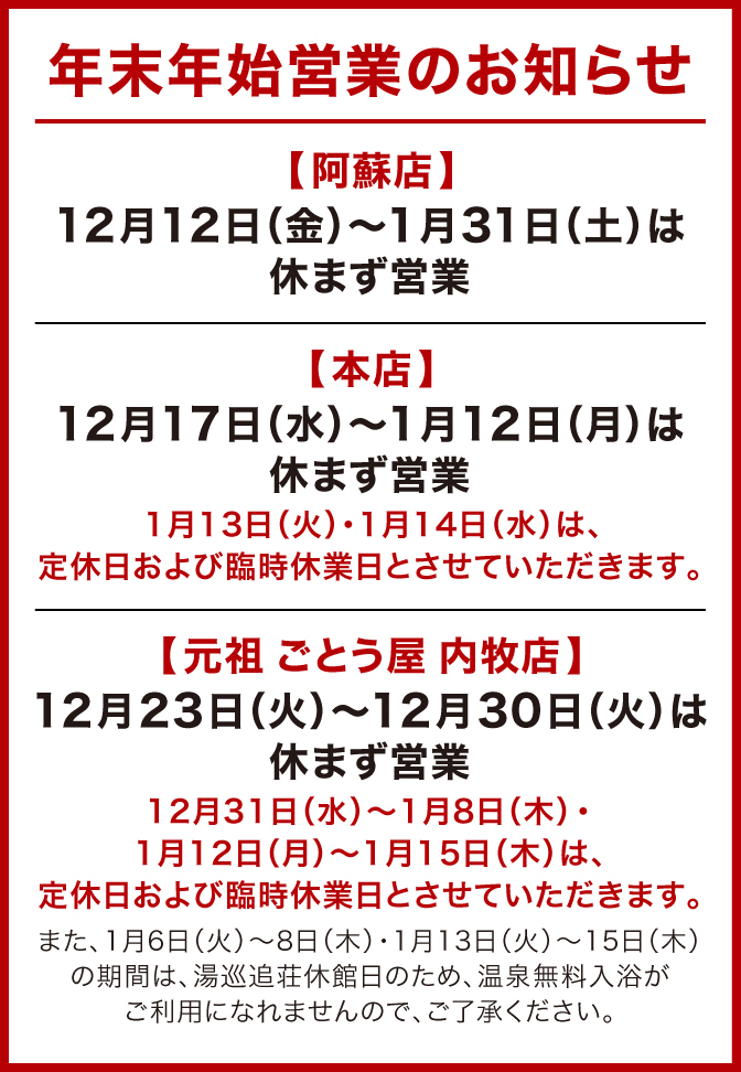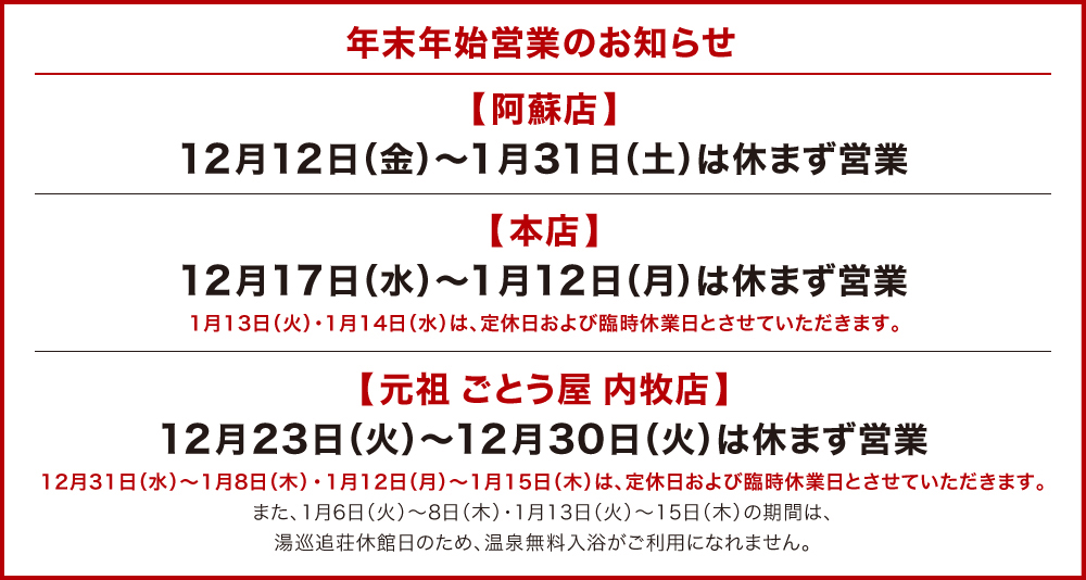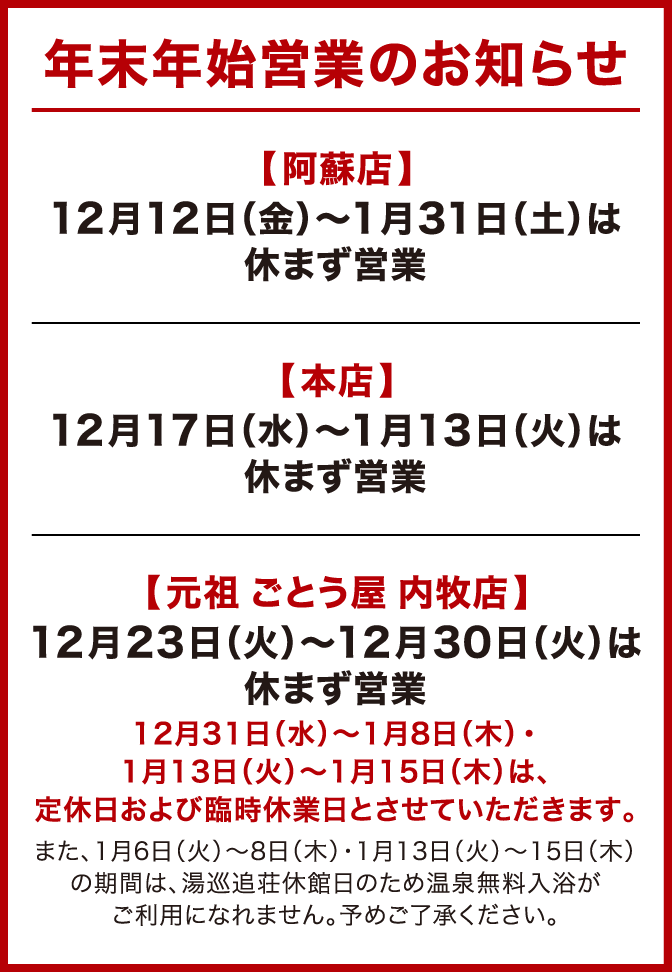 熊本県阿蘇に3つの店舗を構える「あか牛丼専門店 ごとう屋」。 自慢は、なんと言っても雄大な阿蘇が育んだ「あか牛丼」。 おいしさの秘密は、百年もの間続く老舗蔵の特製味噌を使った “あか牛肉みそ” と、 きりりと澄んだコク深い “だし醤油だれ” 。 さらに阿蘇の魅力を伝えるため、「あか牛丼」に加え 「阿蘇高菜あか牛丼」や「元祖あか牛だご汁」などもご提供しています。 ここでしか味わうことができない唯一無二の逸品を、 ぜひ一度ご賞味ください。